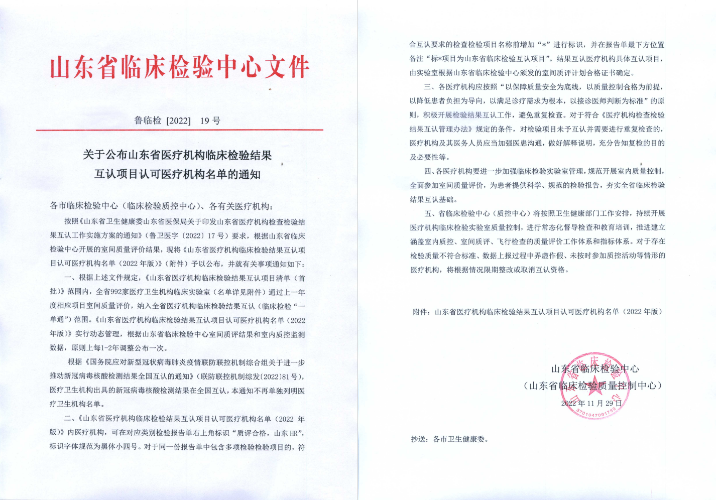 為進(jìn)一步推進(jìn)區(qū)域醫(yī)療資源共享,簡(jiǎn)化患者就醫(yī)環(huán)節(jié),降低診療費(fèi)用,近日,山東省臨床檢驗(yàn)中心按照《山東省衛(wèi)生健康委山東省醫(yī)保局關(guān)于印發(fā)山東省醫(yī)療機(jī)構(gòu)檢查檢驗(yàn)結(jié)果互認(rèn)工作實(shí)施方案的通知》要求,根據(jù)山東省臨床檢驗(yàn)中心開展的室間質(zhì)量評(píng)價(jià)結(jié)果,公布了2022年度全省醫(yī)學(xué)檢驗(yàn)結(jié)果“一單通”認(rèn)可單位及項(xiàng)目名單,濟(jì)南星齊醫(yī)學(xué)以及子公司煙臺(tái)星齊醫(yī)學(xué)作為獨(dú)立醫(yī)學(xué)實(shí)驗(yàn)室位列其中。